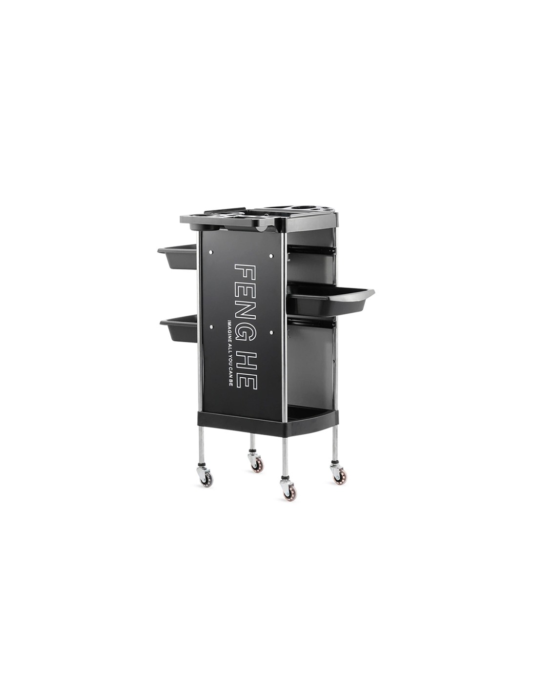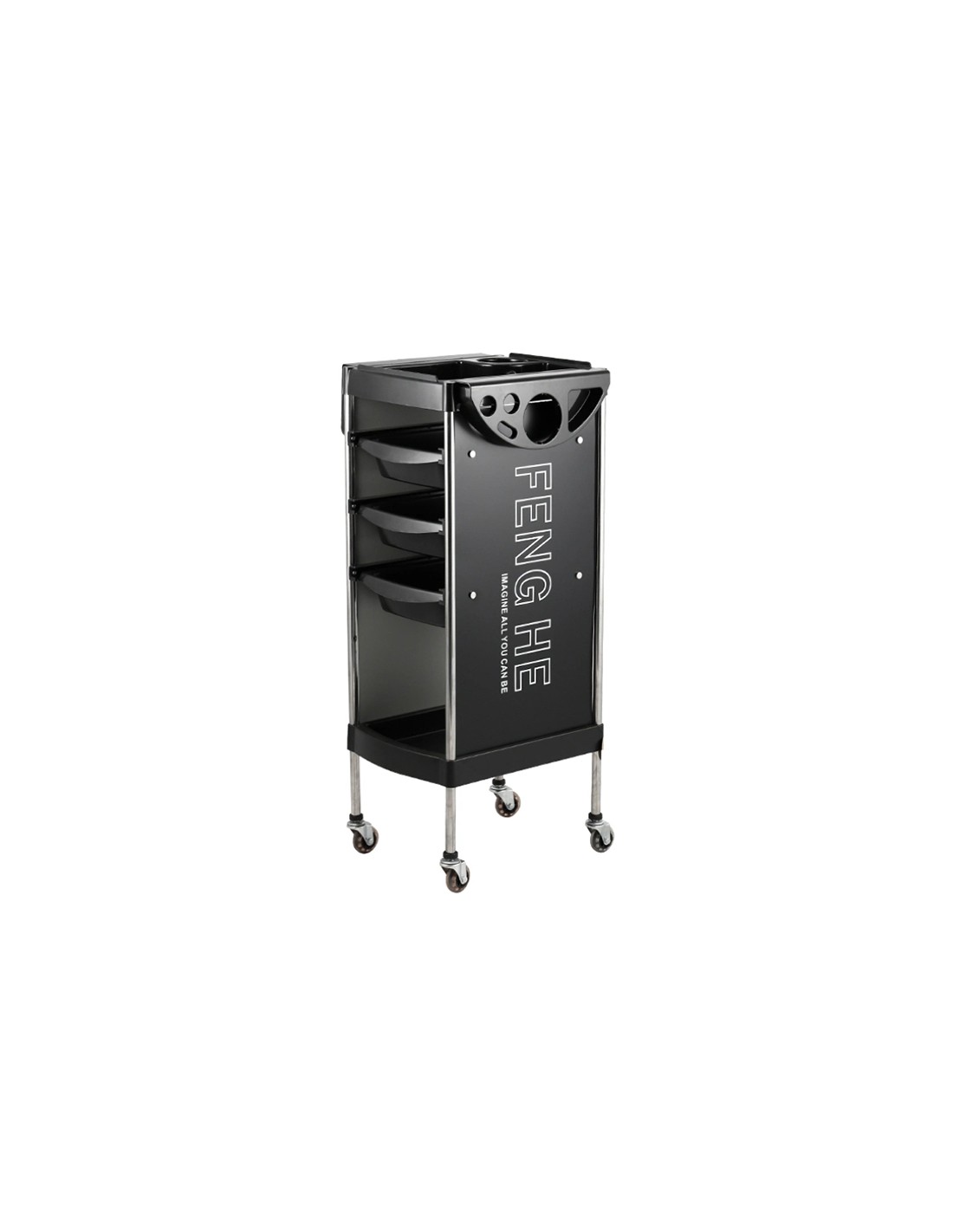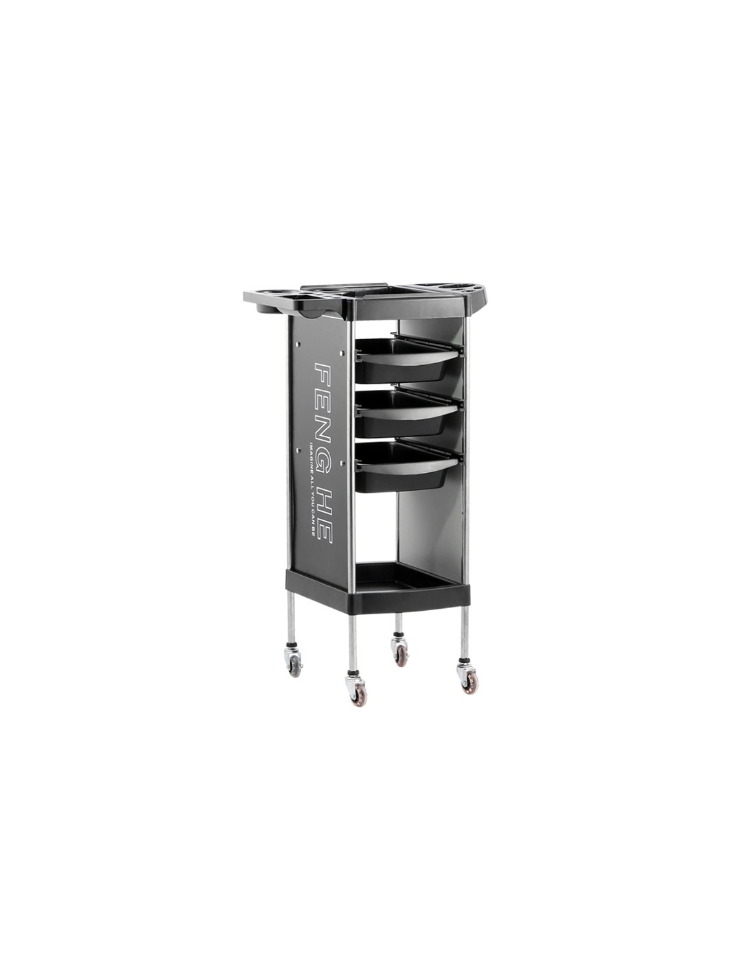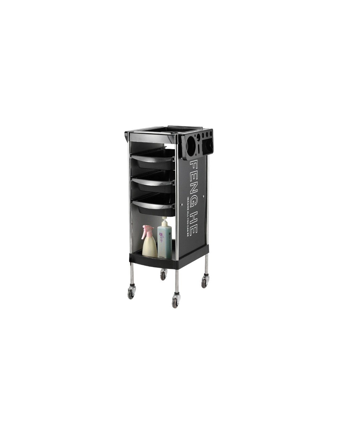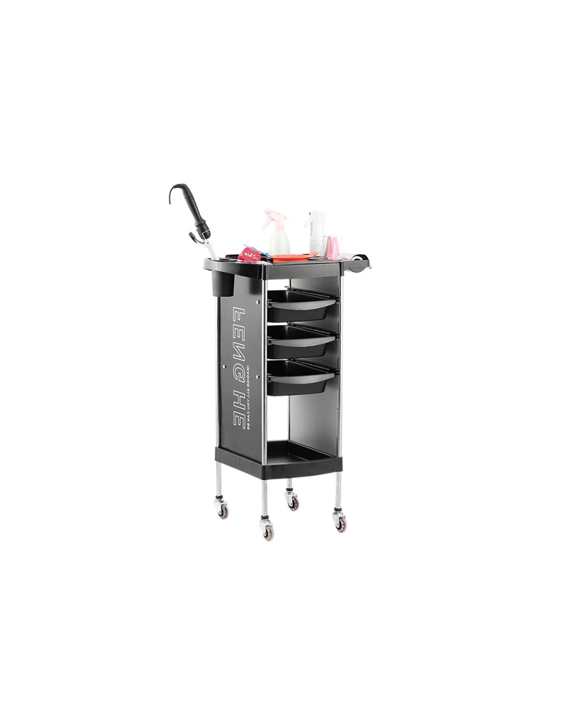 Kolica s tri ladice za što lakše rukovanje i spremanje frizerskih potrepština tijekom rada. Visina: 91 cm, širina 30 cm.