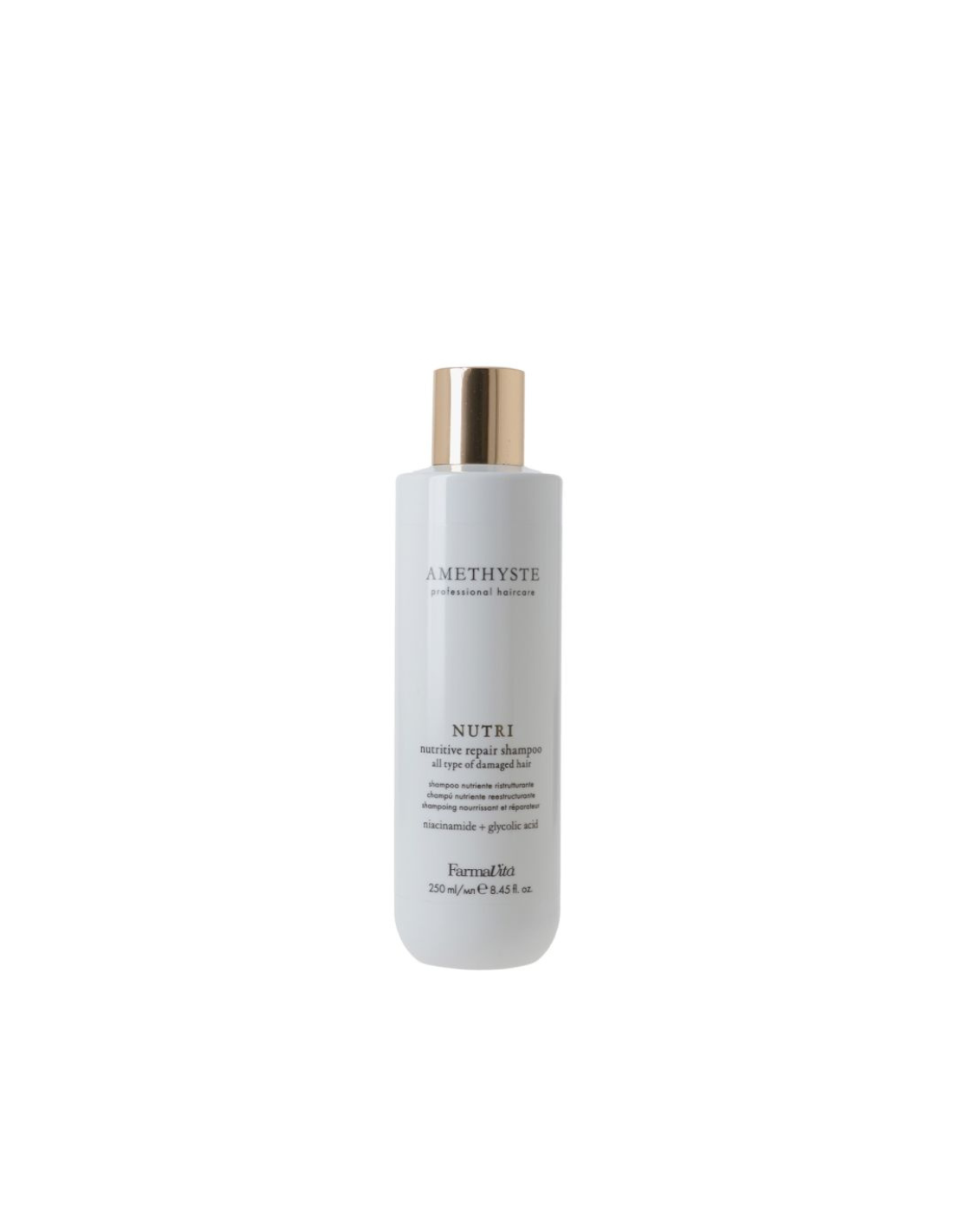 Njegujući i obnavljajući šampon namijenjen oštećenoj kosi. Obogaćen je niacinamidom i glikolnom kiselinom kako bi obnovio strukturu vlasi i ojačao kosu, čineći je ponovno mekom i sjajnom. Linija FarmaVita Amethyste Nutri prikladna je za sve tipove suhe i oštećene kose, pružajući njegu duž cijele vlasi – od korijena do vrhova.