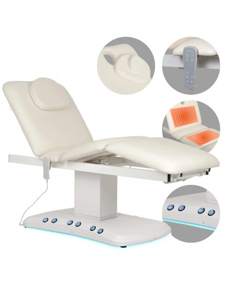 - Grijana površina (35°–60°C): integrirane grijaće podloge u sjedalu i naslonu pružaju ugodnu toplinu – osobito cijenjenu tijekom relaksirajućih, tretmana njege kože ili depilacije.