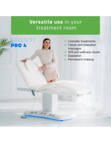 Serenity PRO 4 predstavlja napredan, multifunkcionalan premium ležaj za kozmetičke tretmane, dizajniran kako bi osigurao maksimalnu udobnost klijentu i ergonomsku praktičnost profesionalcu. Sa svojim elegantnim dizajnom, vrhunskom tehnologijom i čvrstom konstrukcijom, Serenity PRO 4 savršeno se uklapa u kozmetičke salone, masažne i fizioterapeutske kabinete, ordinacije estetske medicine, pedikerske salone, SPA centre i tattoo studije.
