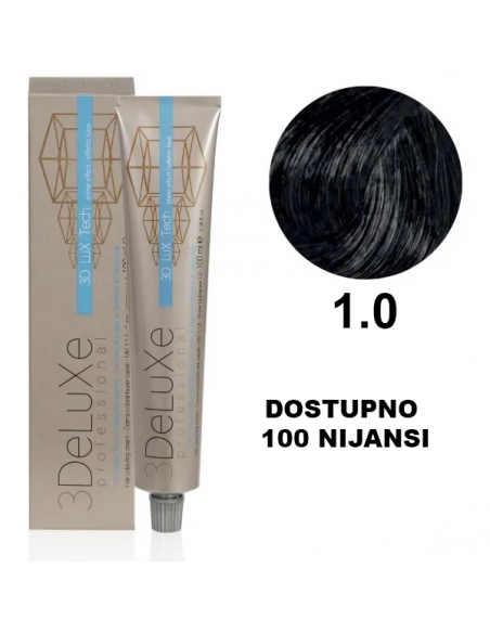 Profesionalna permanentna boja za kosu koja kosi osigurava vrhunsku zaštitu i visoki sjaj. Kvalitetni mikropigmenti prodiru duboko u vlasi, te pružaju savršeno prekrivanje sijedih vlasi i dugotrajnu boju. 3Deluxe Professional boja za kosu bogata je hidratantnim i umirujućim sredstvima koja pomažu u jačanju kose i osiguravaju zaštitu tijekom bojenja. Obogaćena arganovim uljem i ekstraktom nevena. Dostupna u 99 nijansi + 6 tonera (preljeva)