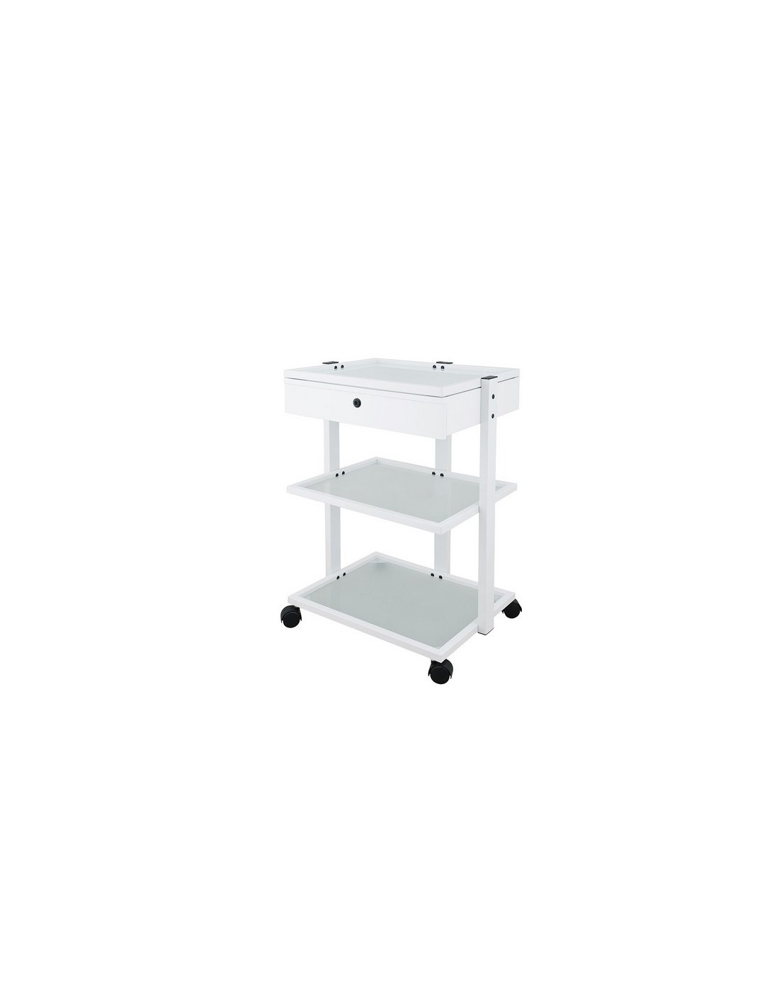 Metalna kolica u bijeloj boji jednostavnog i praktičnog dizajna. Opremljen ladicom za ormare i dvije velike prozirne staklene police za postavljanje instrumenata. Omogućava potpunu pokretljivost zahvaljujući svoja 4 kotača. Veličina proizvoda: 60×46, 5×80, 5 cm Težina: 24 kg.
